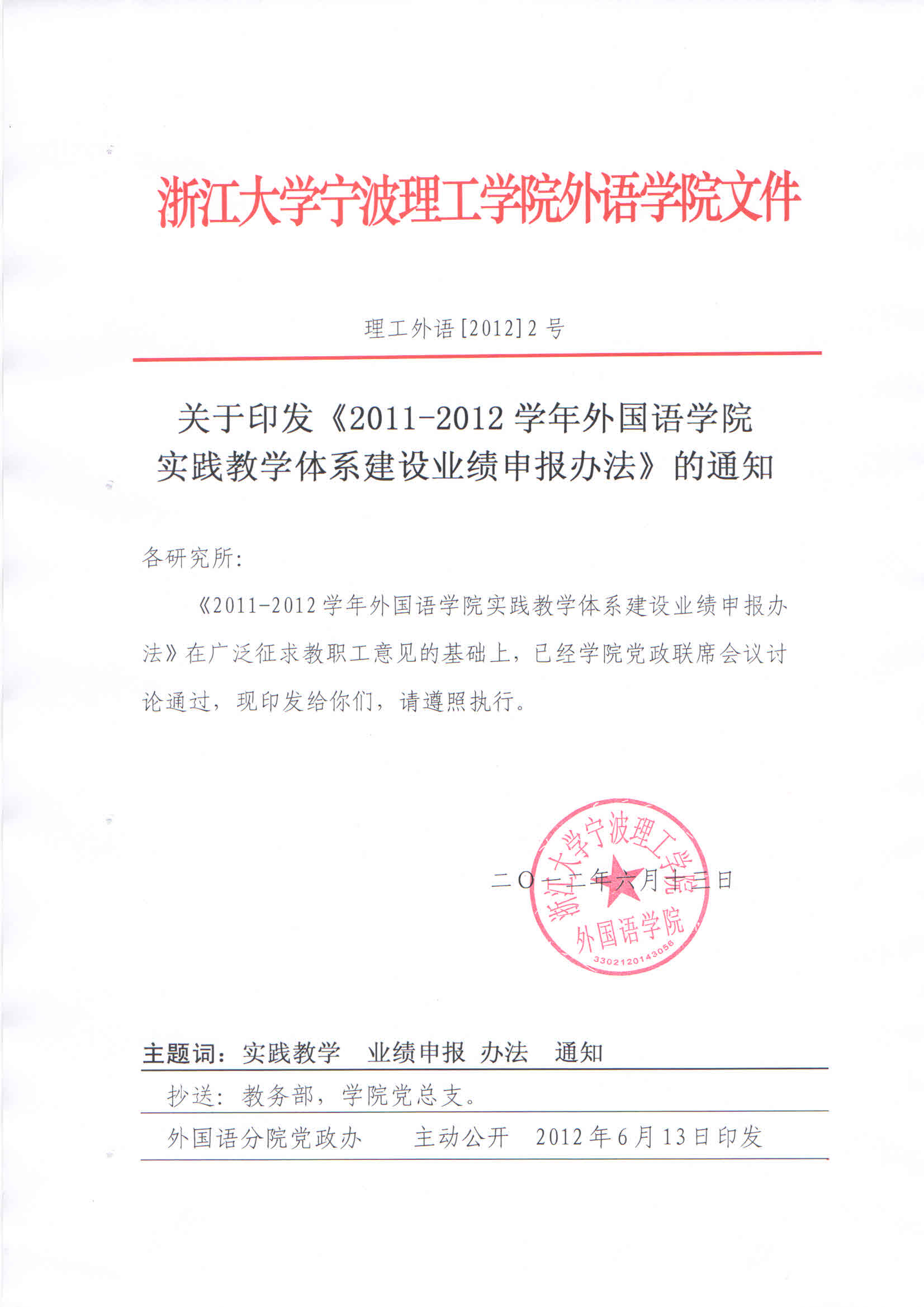 关于印发《2011-2012学年意昂实践教学体系建设业绩申报办法》的通知