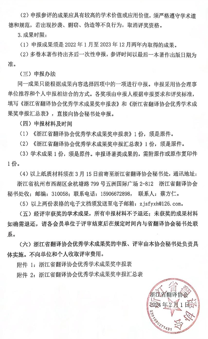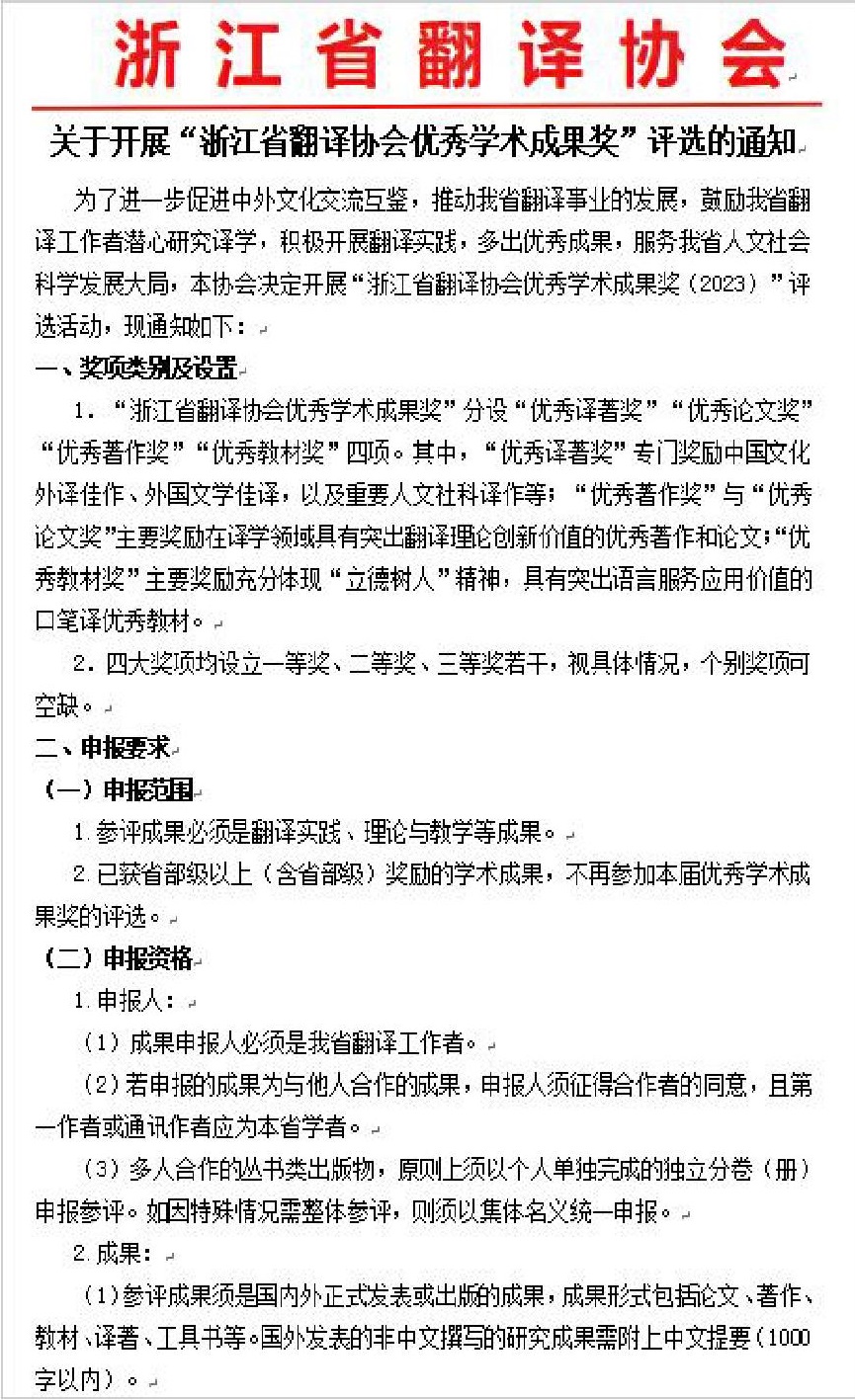 为了进一步促进中外文化交流互鉴,推动我省翻译事业的发展,鼓励我省翻译工作者潜心研究译学,积极开展翻译实践,多出优秀成果,服务我省人文社会科学发展大局。浙江省翻译协会决定开展“浙江省翻译协会优秀学术成果奖(2023)”评选活动。